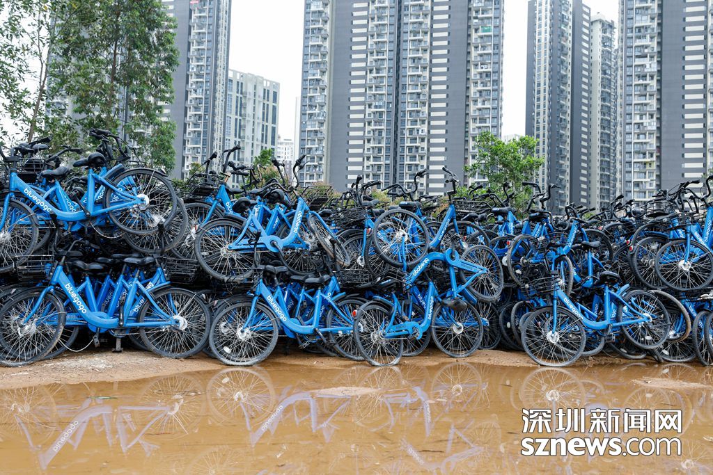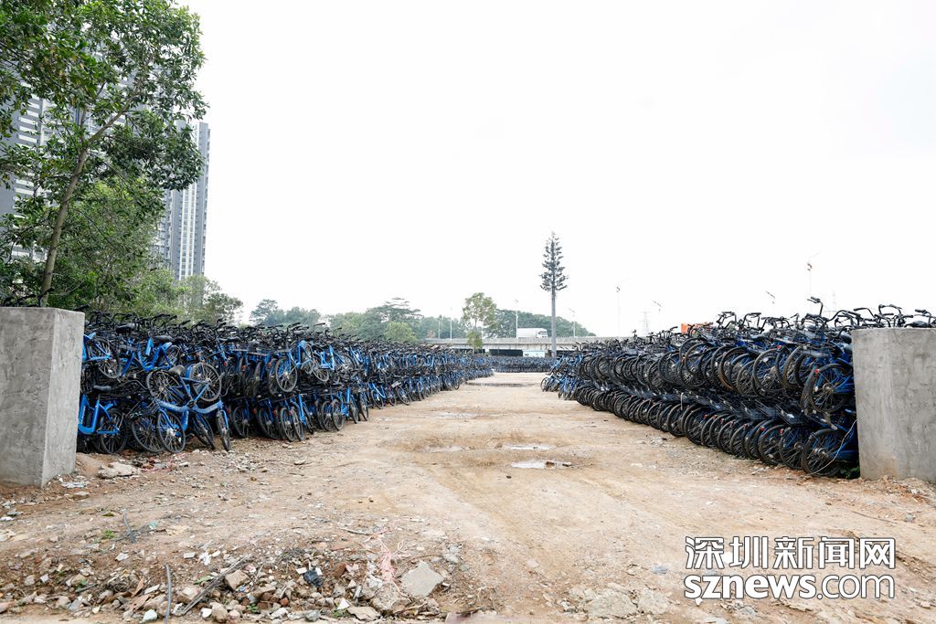 大量的小藍(lán)單車(chē)堆放在龍崗區(qū)水官高速旁的空地