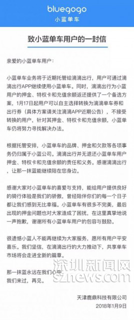 圖為小藍(lán)單車(chē)發(fā)表的聲明(資料圖片)