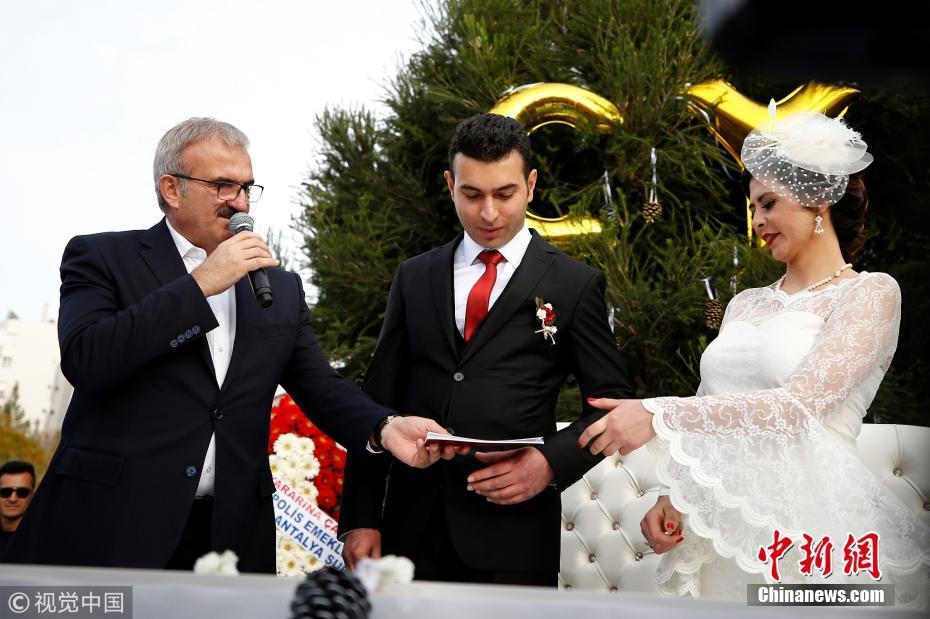 當(dāng)?shù)貢r(shí)間2018年3月21日,土耳其安塔利亞,警官Ceren Ekici和Taha YasinGul舉行婚禮。在10個(gè)月前的一次行動(dòng)中,Taha YasinGul不慎開槍擊中Ceren Ekici的頭部,所幸沒有造成生命危險(xiǎn)。他們的婚禮由警局同事操辦,同事們舉著防彈盾牌,護(hù)送這對(duì)新人走向禮臺(tái)。圖片來源:視覺中國(guó)