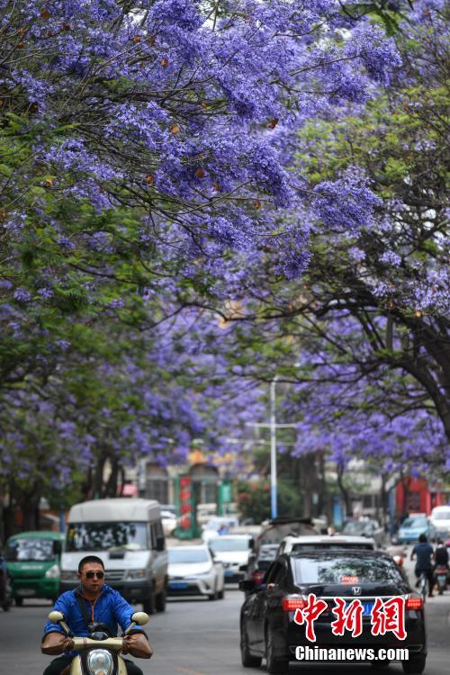 5月2日,昆明市區(qū)一道路兩旁的藍(lán)花楹盛開(kāi),民眾在“花街”穿行。 中新社記者 任東 攝