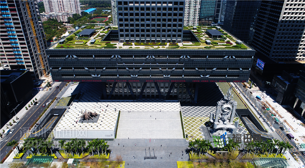 深交所由方正的塔樓和空中懸挑的裙樓所組成,大廈底座被抬升至30多米形成一個(gè)巨大的“漂浮平臺”。