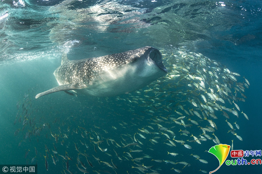 2018年3月30日訊(具體拍攝時間不詳),非洲,一只鯨鯊張開大嘴試圖吞下似龍卷風(fēng)盤旋著的浮游生物群。