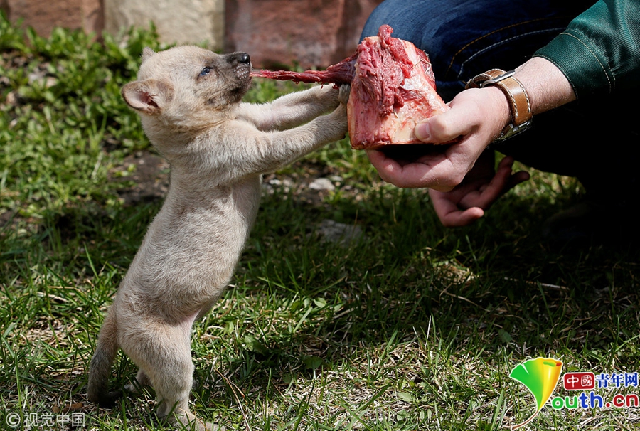 當?shù)貢r間2018年5月11日,俄羅斯克拉斯諾雅茨克,當?shù)貏游飯@飼養(yǎng)員給一只1月大的印度野狗Gelya喂食。