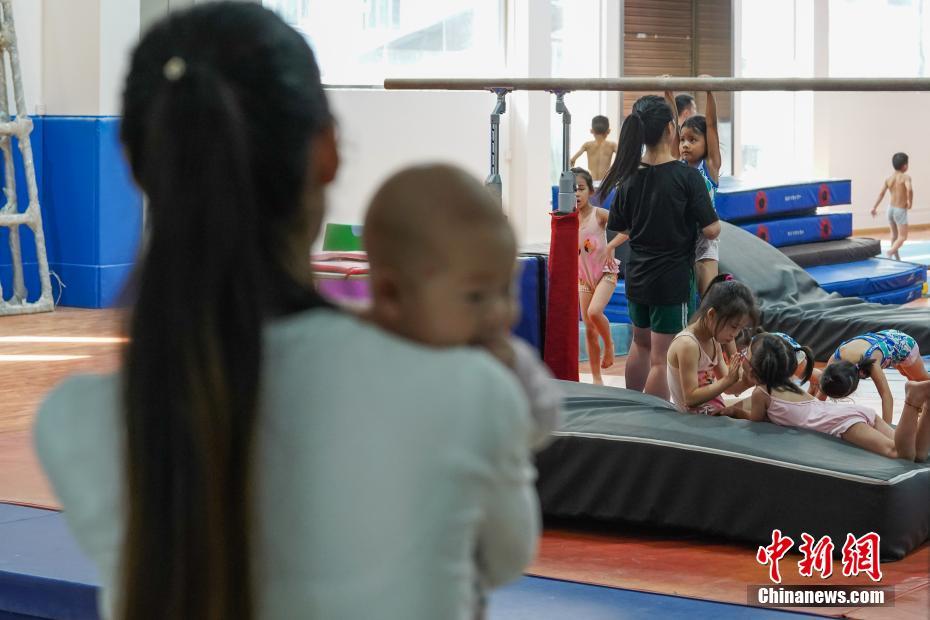 7月16日,貴州榕江,一位母親抱著孩子在訓練室門外看著孩子們訓練。位于月亮山深處的貴州省黔東南苗族侗族自治州榕江縣,數十年來堅持少年兒童體操培養(yǎng)、訓練,對于全縣有良好身體條件的少年兒童進行免費集中培訓。目前該縣每年有60余名兒童在業(yè)余體操運動學校進行訓練。炎炎夏日,孩子們不懼酷暑,刻苦訓練追尋著自己的“體操夢”。據了解,自1972年以來,榕江縣先后向貴州省體操隊、蹦床隊輸送了21名運動員;其中有6名運動員進入國家體操隊,10名運動員榮獲“國家健將級運動員”稱號,5名運動員榮獲“國際健將級運動員”稱號,其中體操名將劉榕冰是2014年體操世錦賽男團冠軍成員之一。2004年,榕江縣被貴州省體育局授予“貴州體操之鄉(xiāng)”稱號。中新社記者賀俊怡 攝