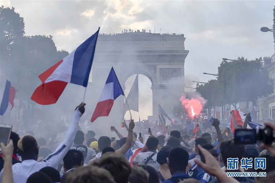 7月15日,法國球迷在巴黎香榭麗舍大街上慶祝法國隊奪冠。