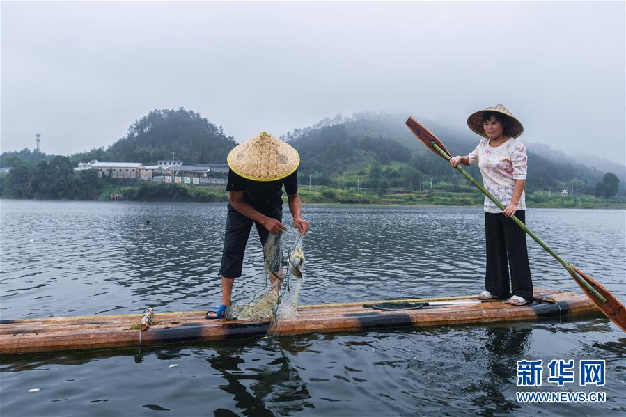 8月1日,淳安縣汾口鎮(zhèn)紅星村的漁民乘著竹排,在千島湖的支流武強(qiáng)溪上進(jìn)行撒網(wǎng)捕撈作業(yè)。 新華社記者 徐昱 攝