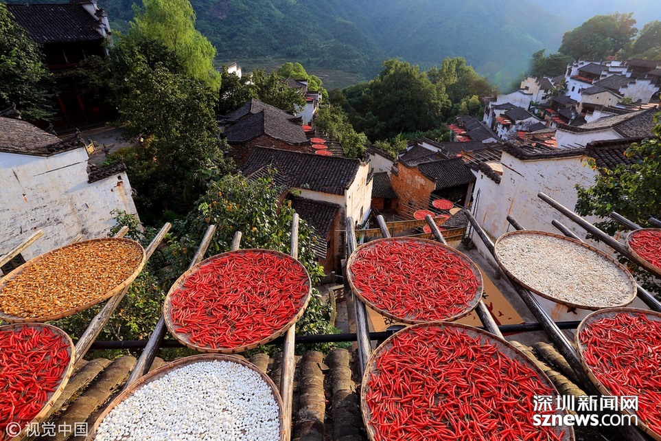 ??? 深圳新聞網(wǎng)訊 2018年8月7日,江西婺源縣篁嶺古村落,壯觀“曬秋”場(chǎng)景。當(dāng)日立秋節(jié)氣,江西婺源縣篁嶺古村的農(nóng)作物普遍豐收,村民們又迎來(lái)了一年一度的“曬秋”季。村民們將收獲來(lái)的紅辣椒、玉米、南瓜、稻谷和菊花等色彩斑斕的農(nóng)作物,晾曬在依山而建的徽派民居房前屋后的木制曬架上,在秋日陽(yáng)光的照射下,色彩繽紛圓圓的曬扁,鋪就在錯(cuò)落有致的徽派民居之間,格外璀璨奪目,蔚為壯觀。目前,“篁嶺曬秋”已經(jīng)成為中國(guó)鄉(xiāng)村旅游的一張名片。