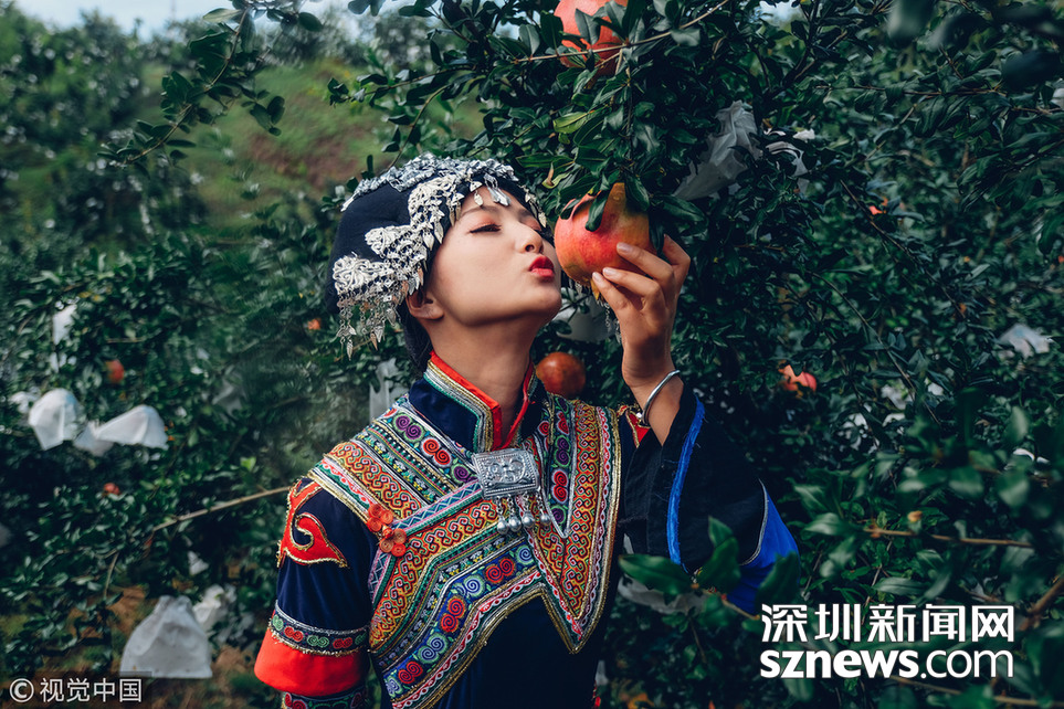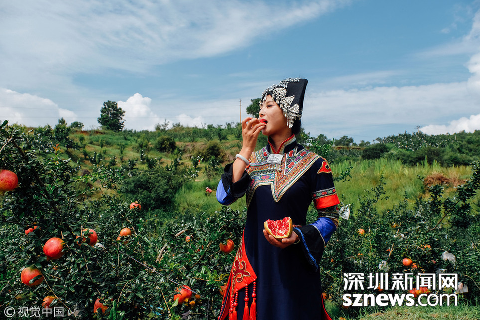 會(huì)理如今大面積種植來(lái)自北非突尼斯的軟籽石榴,籽粒柔軟,可以直接食用無(wú)需吐籽,果味兒濃甜似蜂蜜,可食部位達(dá)55.7%,自然儲(chǔ)藏可達(dá)3個(gè)月,冷庫(kù)儲(chǔ)藏可達(dá)5個(gè)月,是目前世界上籽粒最軟的石榴品種,也是中國(guó)石榴最優(yōu)秀的品種。拍攝當(dāng)天氣溫有些高,鄧通敏穿著比較厚的彝族服裝。完成拍攝后,她迫不及待想嘗嘗這剛從樹(shù)上摘下來(lái)的果子。“太巴適了!”鄧通敏說(shuō)。