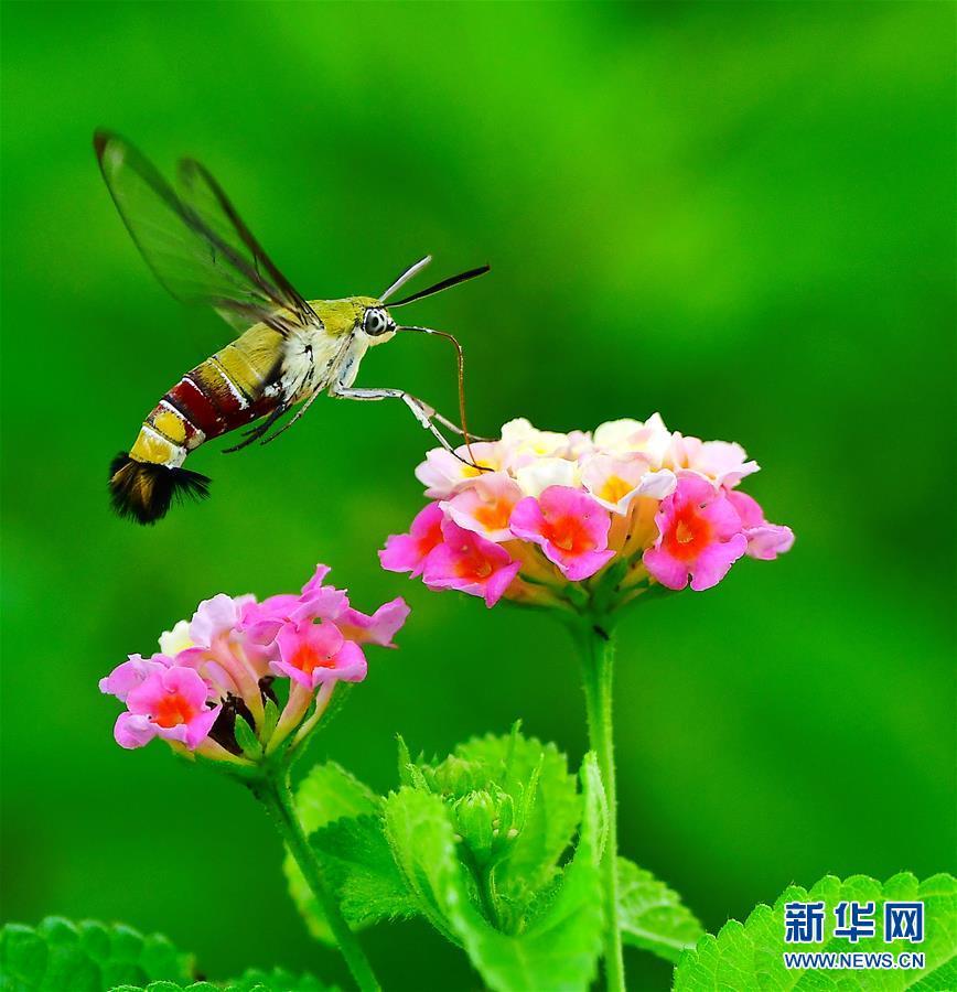 在福建省福州市溫泉公園,透翅天蛾在花間飛舞(8月18日攝)。近日,福建省福州市溫泉公園內(nèi)的馬纓丹大面積開放?;t、草綠、蟲飛,構成了一幅和諧的閩都生態(tài)圖景。 新華社記者梅永存攝