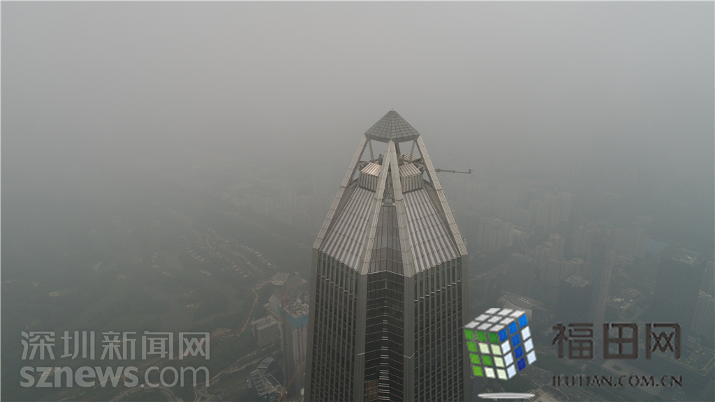 記者在福田中心區(qū)看到,大量的灰霾籠罩在城市上空,不少著名的地標性高樓大廈玩起了“隱身術”。比如,平安金融中心大廈若隱若現,在上午11時、下午4時等灰霾最嚴重時候甚至完全看不見。記者操作無人機航拍福田中心區(qū)的灰霾情況,在海拔500米左右的高空,無人機的視線就被灰霾完全擋住。距離不足一百米的平安金融中心都看不見任何蹤影。