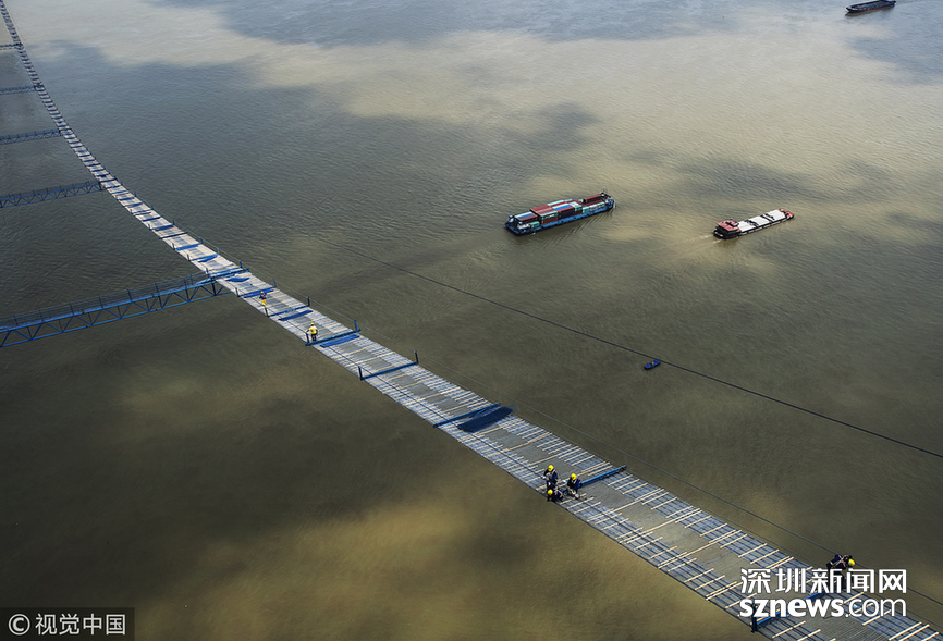 ???? 2018年5月14日,武漢,武漢楊泗港長江大橋上空,上部結(jié)構(gòu)施工進(jìn)入貓道面網(wǎng)鋪設(shè)階段,數(shù)十名中鐵大橋局工人在跨江高空拼搏趕超,江面上空的臨時“吊橋”悄然形成。數(shù)十名工人在長江上空228米處拼搏趕超,臨時“天梯”悄然形成。