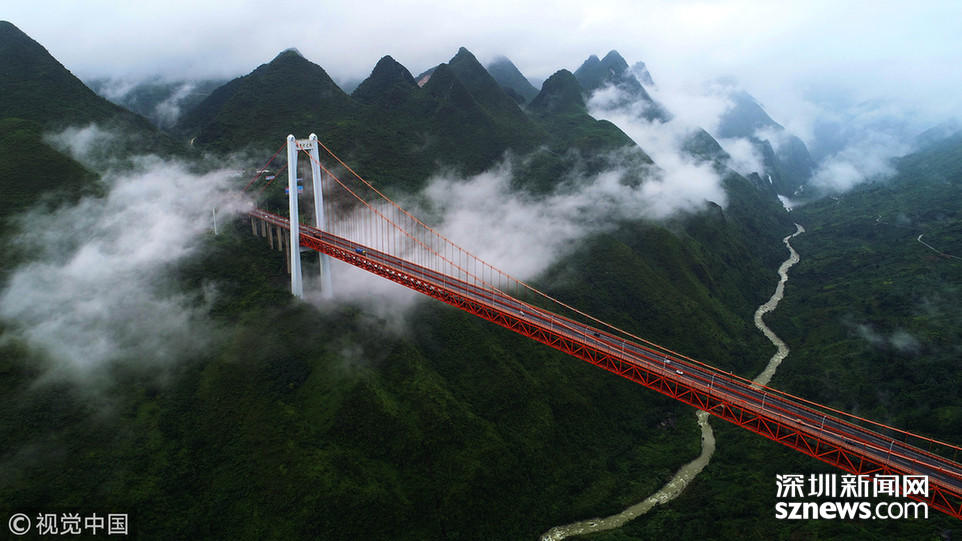 ??? 深圳新聞網(wǎng)訊? 畢都高速公路北盤江大橋是杭瑞高速公路畢都段的控制性工程,位于貴州省和云南省交界處,由貴州省和云南省共建。該橋橋面至江面高差達(dá) 565 米,成為目前世界第一高橋。主橋為鋼桁梁斜拉橋,主跨 720 米,目前位居同類型橋梁2016 年12 月 29 日正式通車。
