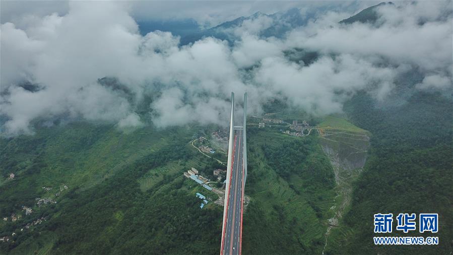 當(dāng)日,杭瑞高速貴州省畢節(jié)至都格(黔滇界)公路北盤江大橋上云霧繚繞,美景如畫。北盤江大橋主橋跨徑720米,橋面到谷底垂直高度565米。