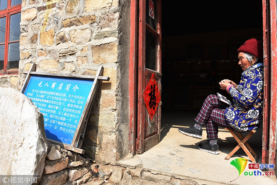 2018年3月11日,在山東省日照市五蓮縣街頭鎮(zhèn)大山深處的李崮寨村,負(fù)責(zé)管理“無(wú)人商店”的老人惠玉秀坐在商店門(mén)口納鞋墊。