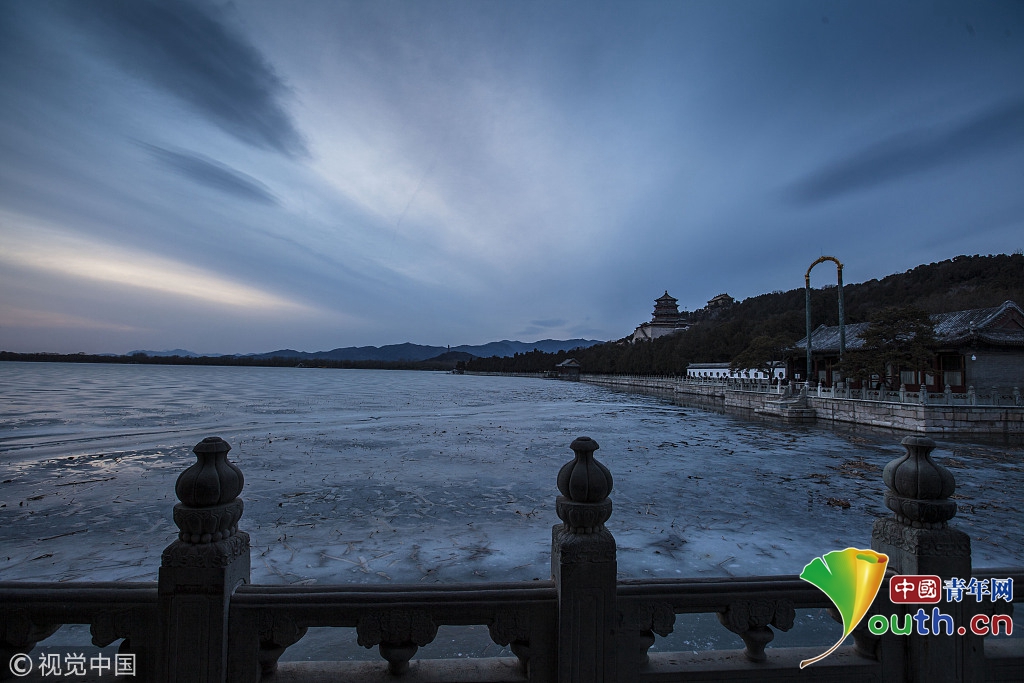2018年2月23日,北京頤和園。當(dāng)天日落時分昆明湖上空出現(xiàn)夕陽余暉的美景,夢幻般的色彩將古老的皇家園林裝扮得美輪美奐,讓人流連忘返。