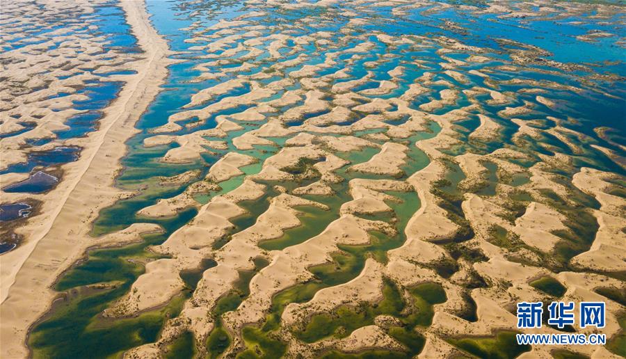 在內(nèi)蒙古鄂爾多斯市杭錦旗境內(nèi)的庫布其沙漠腹地,由凌汛期的黃河水匯聚而成的濕地在日光照射下顯示出絢麗多彩的顏色(6月9日無人機拍攝)。