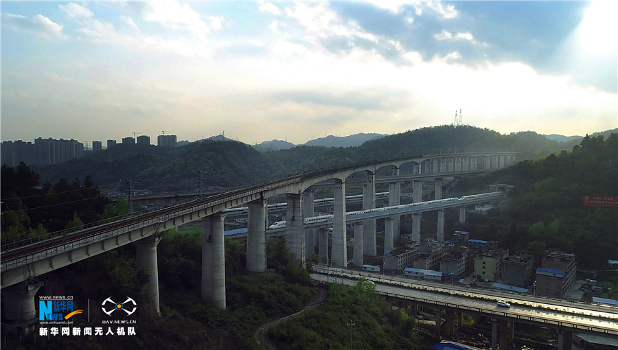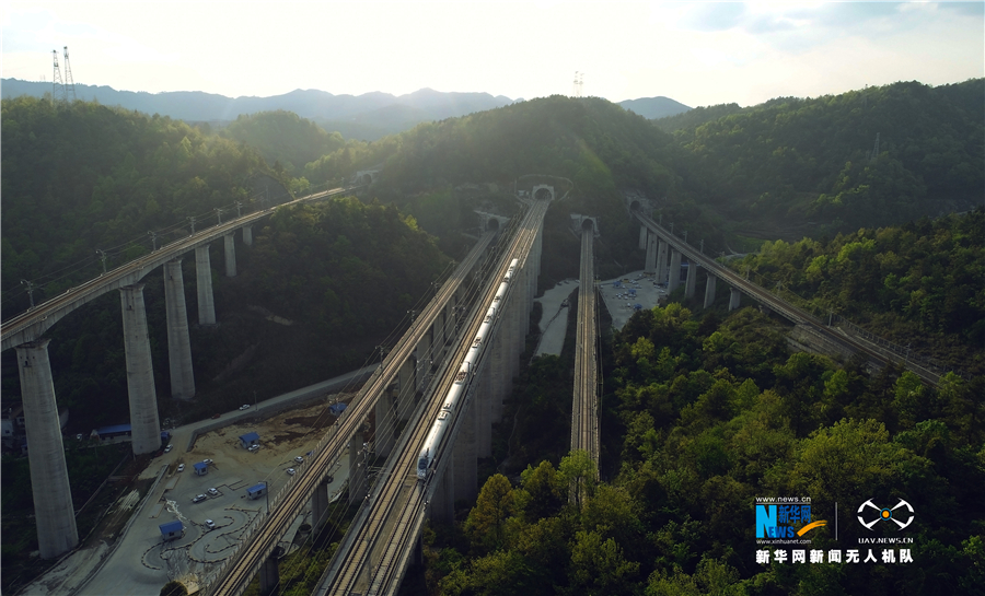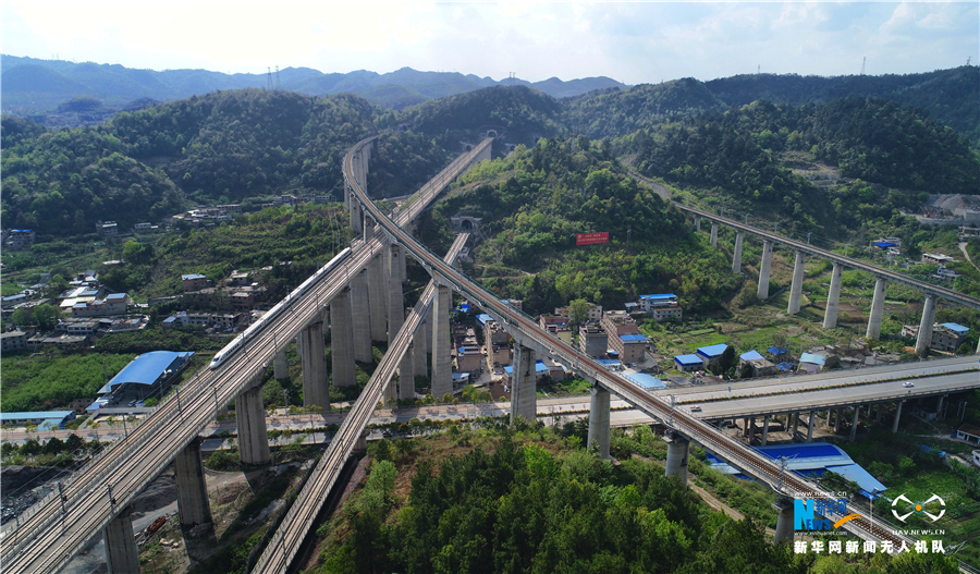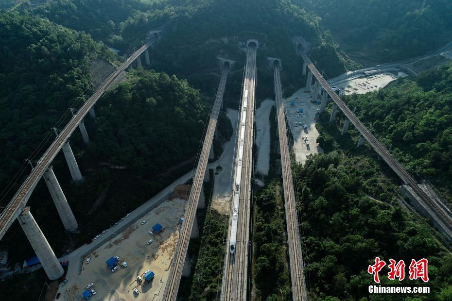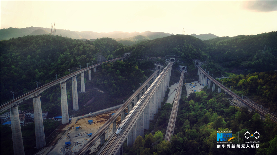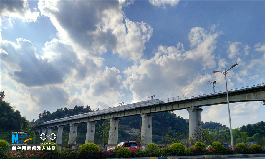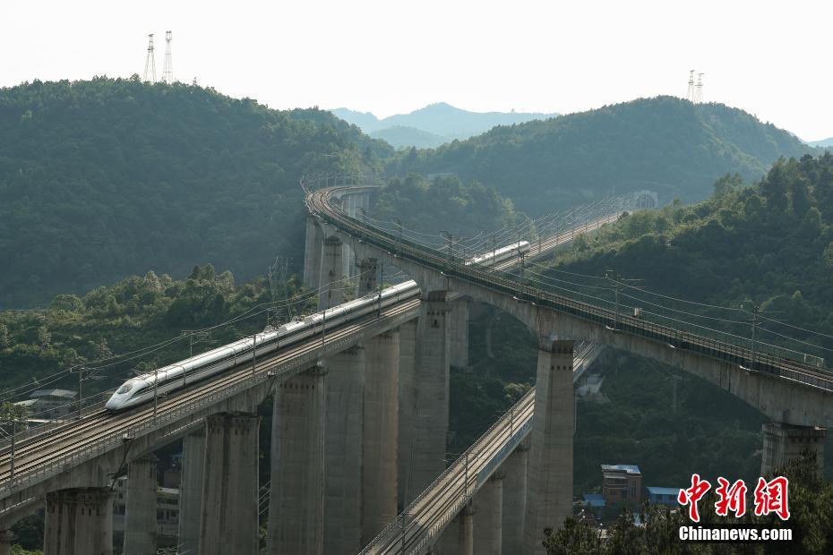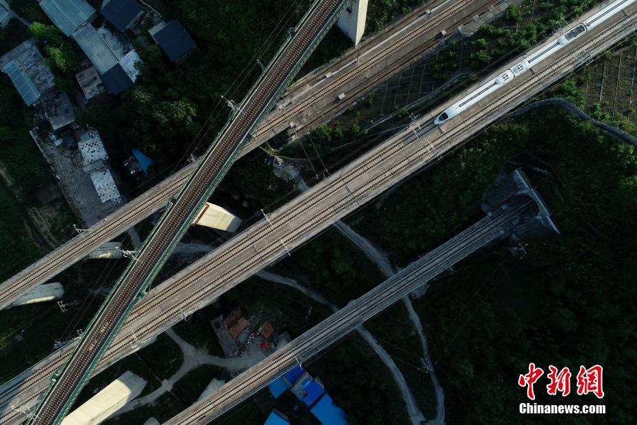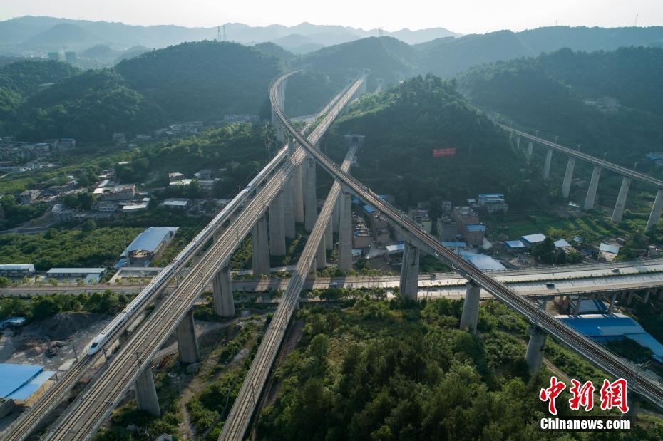 5月16日,航拍貴陽(yáng)市郊交織的五條高鐵線路,一列動(dòng)車駛出隧道。貴州省地處中國(guó)西南腹地,高原山地居多,因此高鐵建設(shè)的橋隧占比較高。在貴陽(yáng)市烏當(dāng)區(qū)新添寨,高鐵滬昆線、貴廣客運(yùn)專線、貴開城際客運(yùn)專線的隧道和橋梁交織在一起,形成“五洞五橋”并行。中新社記者賀俊怡 攝 5月16日,一列動(dòng)車從貴陽(yáng)市郊交織的橋梁上駛過。貴州省地處中國(guó)西南腹地,高原山地居多,因此高鐵建設(shè)的橋隧占比較高。在貴陽(yáng)市烏當(dāng)區(qū)新添寨,高鐵滬昆線、貴廣客運(yùn)專線、貴開城際客運(yùn)專線的隧道和橋梁交織在一起,形成“五洞五橋”并行。中新社記者賀俊怡 攝