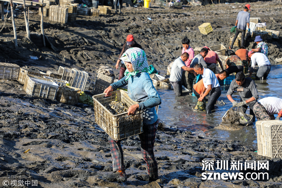 深圳新聞網(wǎng)訊 2018年9月8日,遼寧丹東,早上5點(diǎn),挖蟶人紛紛下到各個(gè)池子,要在海水海泥里艱辛勞作10小時(shí),直至下午3點(diǎn)集體上岸,等待買(mǎi)家的運(yùn)輸車(chē)隊(duì)運(yùn)走他們的勞動(dòng)成果。9月初,遼寧沿海養(yǎng)殖區(qū)進(jìn)入養(yǎng)殖海鮮的收獲季。在東港,常常出現(xiàn)數(shù)百人乃至上千人集結(jié)在池子里挖蟶子(這里特指縊蟶,即東港當(dāng)?shù)厝怂f(shuō)的小人仙。下同)的壯觀(guān)景象。在養(yǎng)殖海鮮的收獲季,成群的海鷗趁機(jī)“助陣“,人與大自然和諧共處的畫(huà)面令人嘆為觀(guān)止。