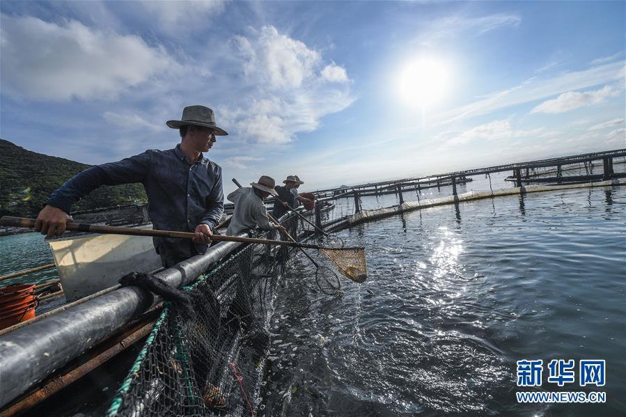 8月18日,南麂島海域的“海上牧場”養(yǎng)殖區(qū)內(nèi),漁民正捕撈大黃魚,處于仿生養(yǎng)殖環(huán)境的大黃魚需要生長2至3年。進(jìn)入8月,浙江省溫州市平陽縣南麂鎮(zhèn)海域上大片的大黃魚、貽貝等特色海產(chǎn)品養(yǎng)殖區(qū)域迎來豐收季節(jié),養(yǎng)殖戶們駕駛漁船在養(yǎng)殖區(qū)海域進(jìn)行打撈收獲,在碧海藍(lán)天下構(gòu)成了一幅“海上牧場”的美麗豐收景象。近年來,南麂鎮(zhèn)政府引導(dǎo)漁民養(yǎng)殖戶充分發(fā)揮“靠海吃?!钡馁Y源優(yōu)勢,大力發(fā)展海洋養(yǎng)殖經(jīng)濟(jì)和海島旅游經(jīng)濟(jì),實現(xiàn)了南麂由“生態(tài)美”向“產(chǎn)業(yè)美”,“產(chǎn)業(yè)美”向“經(jīng)濟(jì)美”的轉(zhuǎn)變。同時該鎮(zhèn)堅持以大黃魚、貽貝等為特色產(chǎn)業(yè)支撐,精準(zhǔn)發(fā)展高效海洋養(yǎng)殖業(yè),重點培養(yǎng)一批新型職業(yè)漁民,依靠專業(yè)技術(shù)支持,實現(xiàn)深海仿生養(yǎng)殖,讓好生態(tài)造就好品質(zhì),重點打造南麂養(yǎng)殖品牌,組建營銷網(wǎng)絡(luò),拓展特色海產(chǎn)品市場。新華社記者 徐昱攝