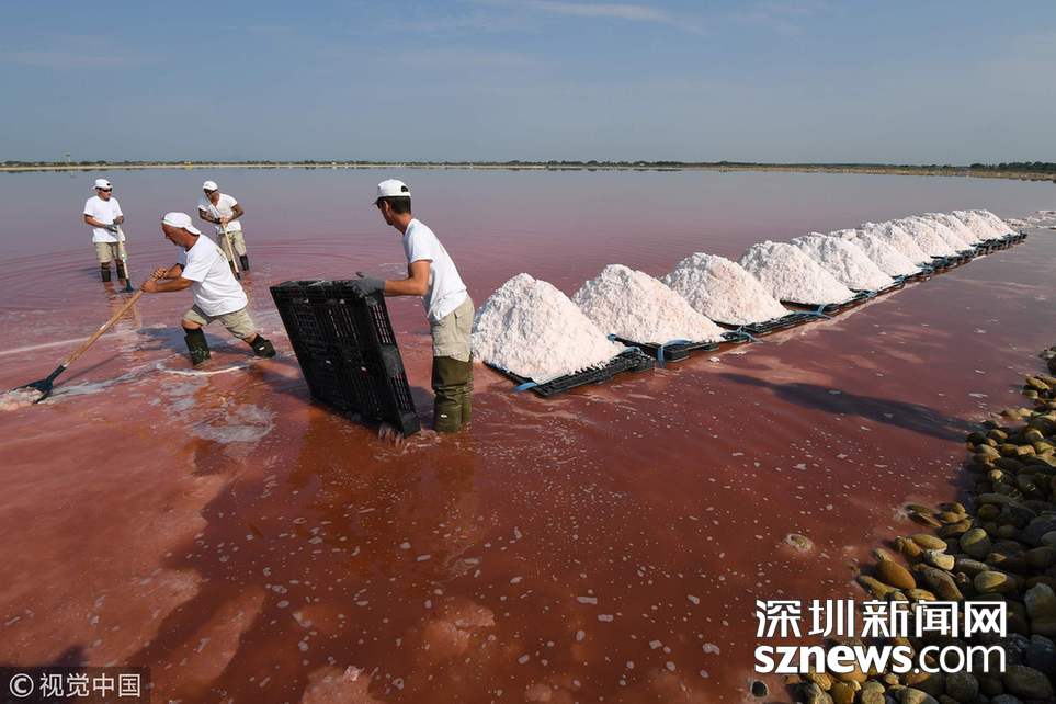 深圳新聞網(wǎng)訊? 法國艾格莫特,工人們在鹽灘收集鹽晶體,那里的鹽場面積達1萬公頃。在收獲了手工海鹽“鹽之花”之后,他們必須等到九月份才能收獲用作食鹽的鹽?!胞}之花”是世界上最昂貴的鹽之一(100g價格可達數(shù)千元)。