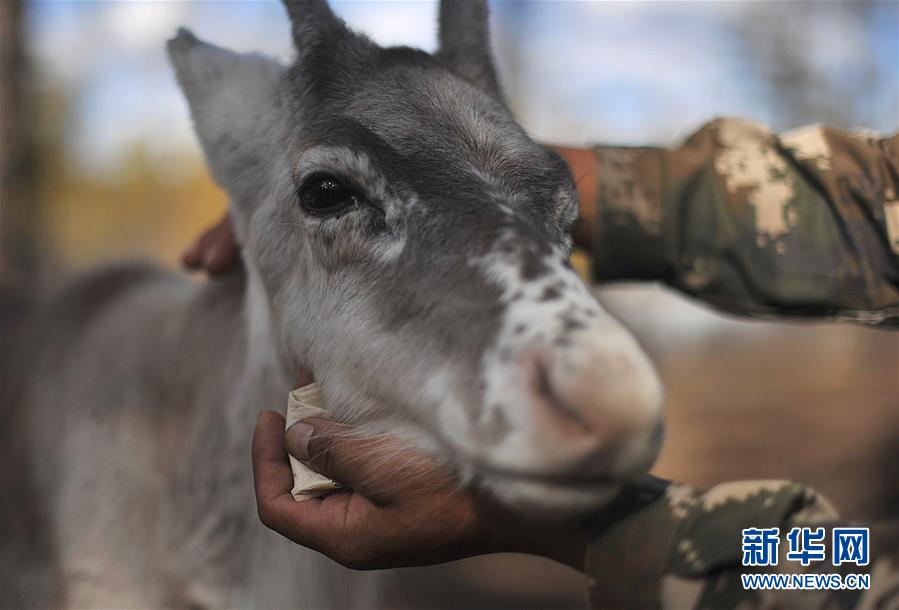 9月18日,在內(nèi)蒙古大興安嶺根河林業(yè)局約安里林場(chǎng),林場(chǎng)職工張國(guó)華愛撫著馴鹿“混血寶寶”。新華社記者于洋攝