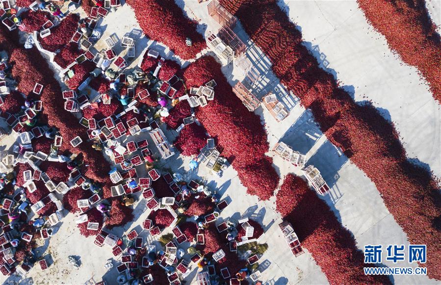 9月19日,在吉林省白城市通榆縣,農(nóng)民在分揀收獲的辣椒(無人機拍攝)。