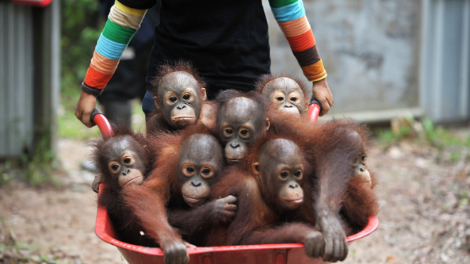 猩猩寶寶擠“校車”“上學(xué)”超萌