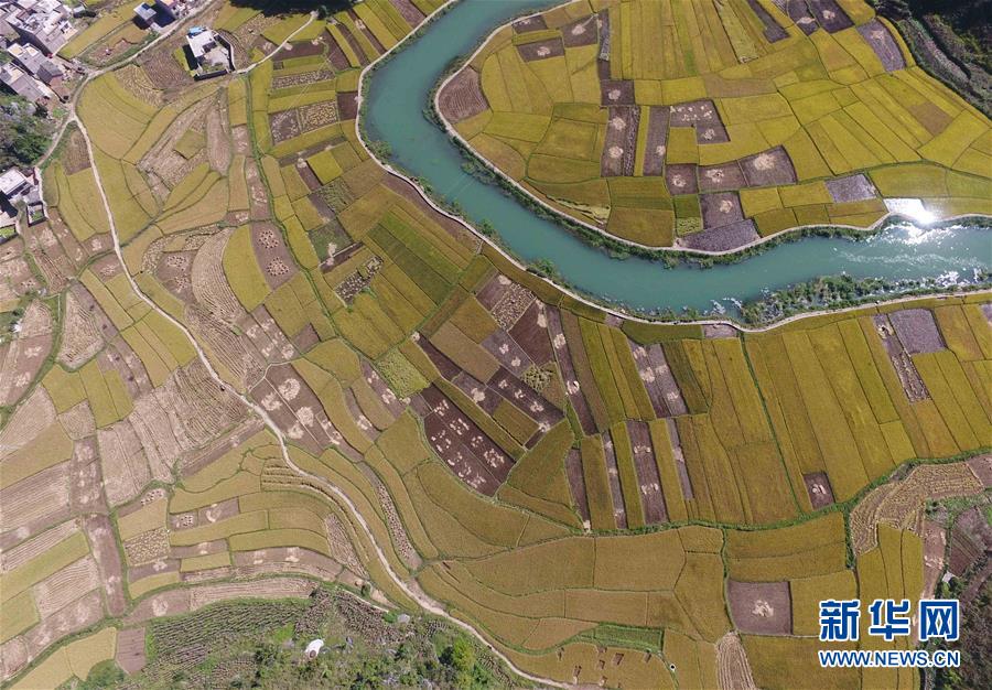 這是廣南縣八寶鎮(zhèn)壩龍村的田園景色(9月20日無人機(jī)拍攝)。 云南省文山壯族苗族自治州廣南縣八寶鎮(zhèn)今年種植優(yōu)質(zhì)水稻22000余畝,秋收季節(jié),田野里一片金黃,景色如畫。 新華社記者楊宗友攝
