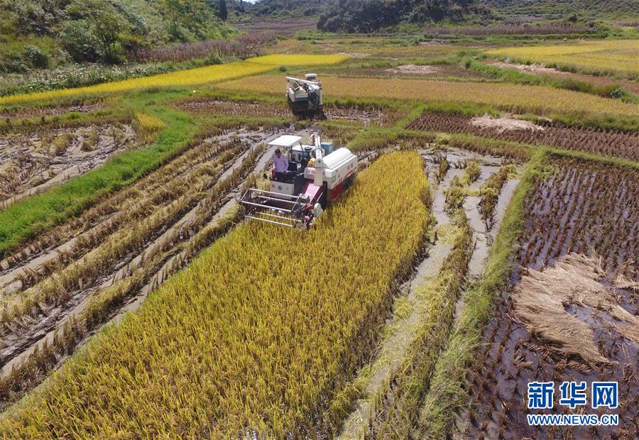 9月20日,廣南縣八寶鎮(zhèn)壩龍村的農(nóng)民在用收割機(jī)收稻谷(無人機(jī)拍攝)。 云南省文山壯族苗族自治州廣南縣八寶鎮(zhèn)今年種植優(yōu)質(zhì)水稻22000余畝,秋收季節(jié),田野里一片金黃,景色如畫。 新華社記者楊宗友攝