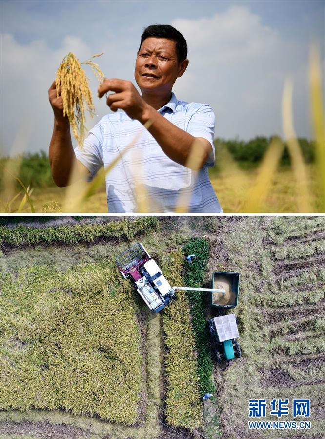 這張拼版照片顯示的是:上圖,9月12日,安徽省肥西縣山南鎮(zhèn)小井莊村種糧大戶陳良玉在查看水稻稻粒;下圖,9月12日,陳良玉和農(nóng)機(jī)手駕駛機(jī)械在稻田里忙碌(無人機(jī)拍攝)。 新華社記者劉軍喜攝