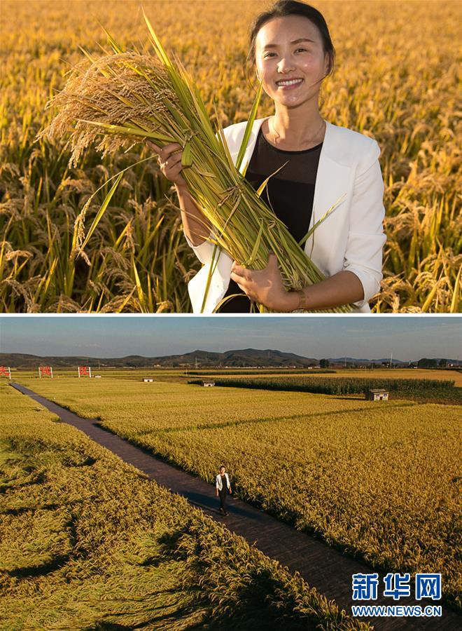 這張拼版照片顯示的是:上圖,9月19日,在吉林省舒蘭市白旗鎮(zhèn)松江村,返鄉(xiāng)創(chuàng)業(yè)成立有機水稻合作社的蔡雪在稻田間捧著剛收割的早稻;下圖,9月19日,蔡雪行走在稻田間的棧道上(無人機拍攝)。