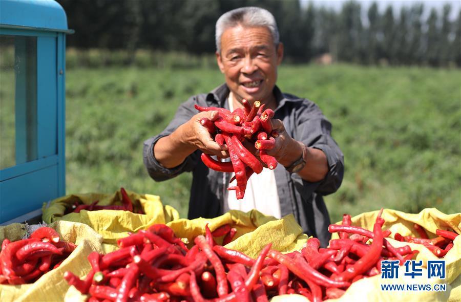 9月16日,阜城縣王集鄉(xiāng)南張莊村農(nóng)民在展示采摘的辣椒。近年來,河北省阜城縣王集鄉(xiāng)在推進產(chǎn)業(yè)富民過程中,積極引導(dǎo)農(nóng)民調(diào)整農(nóng)業(yè)產(chǎn)業(yè)結(jié)構(gòu),按照品種特色化、種植規(guī)?;?、產(chǎn)銷一體化的“公司+基地+農(nóng)戶”的經(jīng)營模式,鼓勵農(nóng)民發(fā)展特色辣椒種植,推行“訂單種植”模式,開辟出了一條農(nóng)民創(chuàng)收新路徑。目前,阜城縣王集鄉(xiāng)辣椒種植面積3100余畝,每畝年收益2500元以上,帶動當?shù)剞r(nóng)民實現(xiàn)增收。新華社記者朱旭東攝