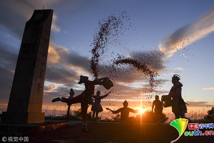 9月26日,長三角第一高峰浙江龍泉山農(nóng)作物喜獲豐收,當(dāng)?shù)剞r(nóng)民與游客用8噸剛收獲的辣椒以及玉米,在山頂?shù)脑坪V衅闯隽艘幻骈L10米、寬6.6米的巨型國旗慶祝豐收。