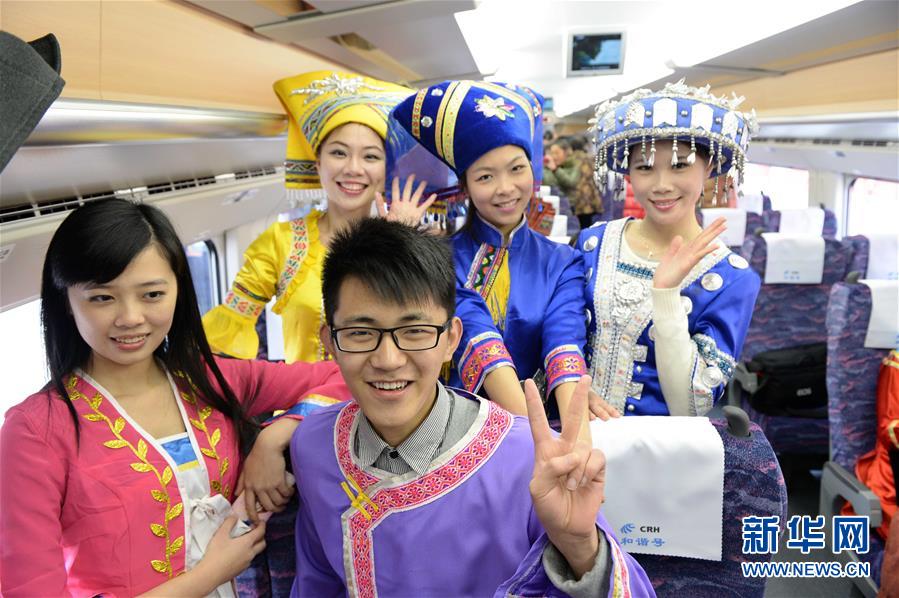 在廣西南寧站,身著民族服裝的乘客搭乘動(dòng)車準(zhǔn)備出行(2013年12月30日攝)。 廣西壯族自治區(qū)成立60年來,鐵路建設(shè)發(fā)生翻天覆地的變化。來自中國(guó)鐵路南寧局集團(tuán)有限公司的數(shù)據(jù)顯示,1958年廣西鐵路總里程為1346.3公里,如今廣西鐵路總里程達(dá)5191公里。廣西與周邊相鄰省份間實(shí)現(xiàn)動(dòng)車“公交化”開行。此外,北部灣港—重慶班列、東盟海產(chǎn)品冷鏈班列、“百色一號(hào)”果蔬專列等的開通和運(yùn)營(yíng),強(qiáng)化了鐵路供給的針對(duì)性和有效性。鐵路成為助推廣西經(jīng)濟(jì)社會(huì)快速發(fā)展的“大動(dòng)脈”。 新華社記者周華攝