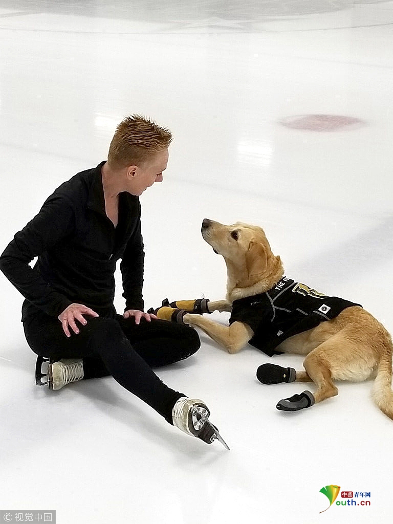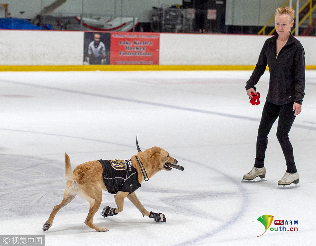 如今五歲的本尼學習滑冰已有一年,每周兩次在拉斯維加斯冰上中心接受主人的訓練,學習一系列包括轉彎、交叉、兔子跳等動作技巧。
