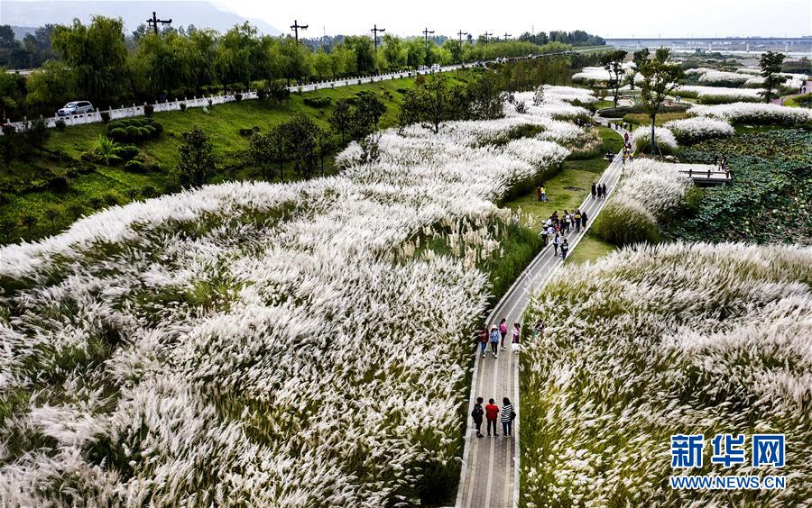 9月28日,人們?cè)谔J花盛開的漢江濕地公園里游覽(無(wú)人機(jī)拍攝)。新華社記者陶明 攝