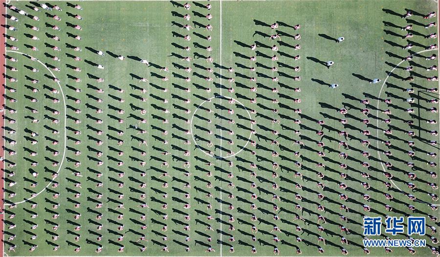 在小崗村小崗學(xué)校,學(xué)生們?cè)隗w育展示課上做操(9月27日無(wú)人機(jī)拍攝)。 新華社記者 才揚(yáng)攝
