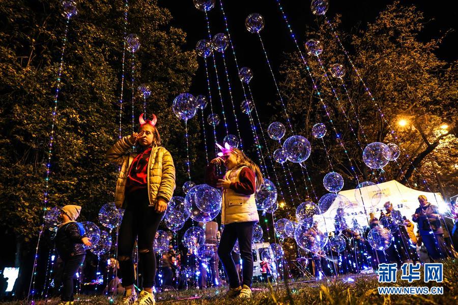 9月28日,游客在波蘭羅茲市中心舉辦的2018“舞動”燈光節(jié)上游玩。2018“舞動”燈光節(jié)于9月28日至30日在波蘭中部交通樞紐城市——羅茲市舉行,各式各樣的光影表演在這座城市的各個角落同時上演,組成了一場如夢如幻的大型燈光秀。新華社記者陳序攝