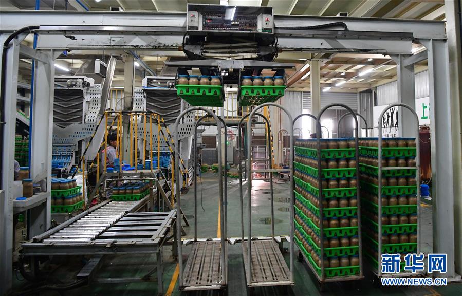 在位于清豐縣的河南龍豐實(shí)業(yè)股份有限公司,“機(jī)械手”在裝瓶車(chē)間自動(dòng)轉(zhuǎn)運(yùn)食用菌栽培瓶(9月28日攝)。新華社記者馮大鵬攝