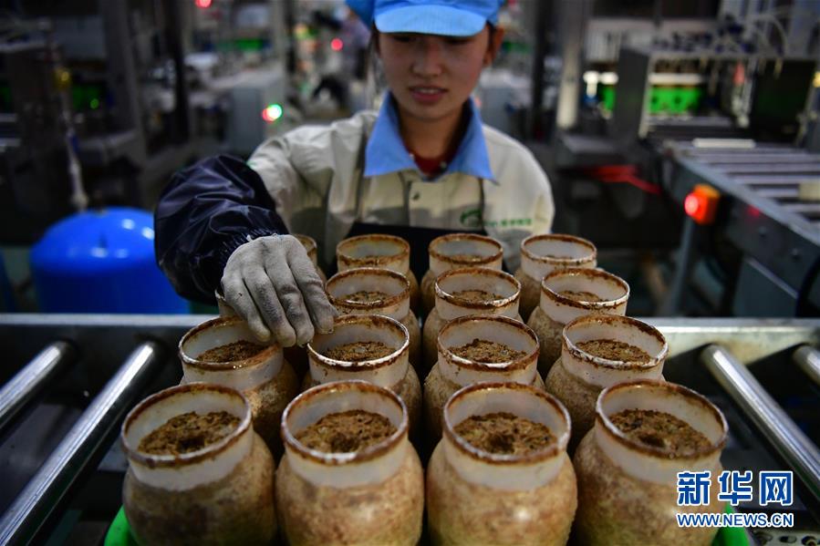 在位于清豐縣的河南龍豐實業(yè)股份有限公司,一名工人在車間查看補(bǔ)水過后的食用菌栽培瓶(9月28日攝)。新華社記者馮大鵬攝