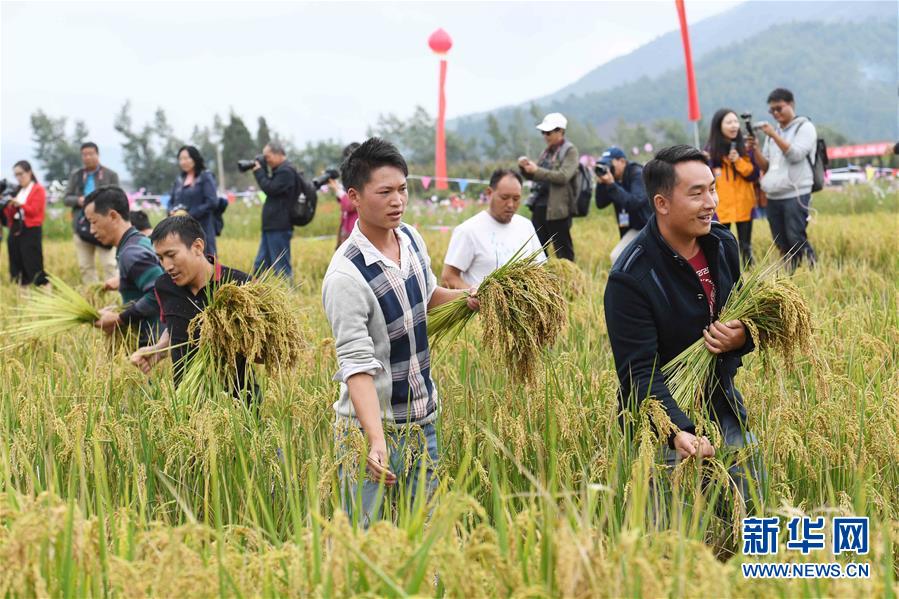 9月29日,人們參加拔谷穗比賽。9月29日,云南省尋甸回族彝族自治縣2018年首屆農(nóng)民豐收節(jié)暨第二屆摸魚節(jié)在雞街鎮(zhèn)舉行,當?shù)剞r(nóng)民和游客在豐收的稻田里進行摸魚、拔谷穗、山歌對唱等活動,享受收獲的喜悅。新華社記者楊宗友攝