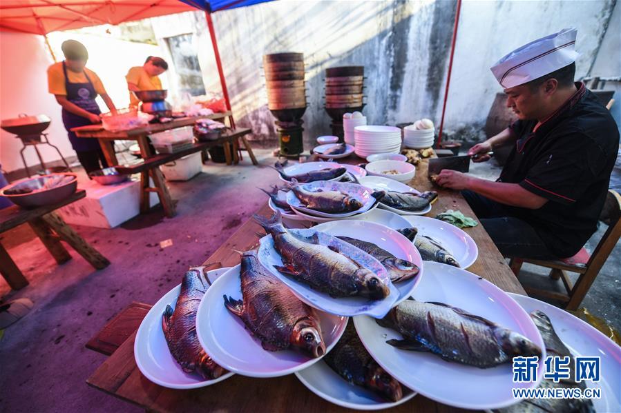 9月30日,工作人員在準(zhǔn)備江鮮宴席。當(dāng)日,浙江省杭州市富陽區(qū)場口鎮(zhèn)東梓關(guān)村開啟“江鮮第一鍋”,幾位大廚聯(lián)手在直徑1.5米的大鍋內(nèi)烹制美味江鮮,這也是當(dāng)?shù)亍敖r大會(huì)”的重頭戲。東梓關(guān)村有著1000多年歷史,古就是富春江南岸重要的商貿(mào)集散地,素有富春江“東流第一關(guān)”之稱。隨著近年來美麗鄉(xiāng)村建設(shè)的推進(jìn),東梓關(guān)村著力打造粉墻黛瓦的江南民居,同時(shí)依托富春江豐富的江鮮魚類資源,在秋季舉辦特色“江鮮大會(huì)”,通過江鮮捕撈體驗(yàn)、江鮮第一鍋、百鮮宴、農(nóng)家菜大賽等活動(dòng),吸引各地游客前來感受富春江漁民豐收的喜悅和千年古村的獨(dú)特魅力,推動(dòng)鄉(xiāng)村特色旅游發(fā)展。新華社記者徐昱攝