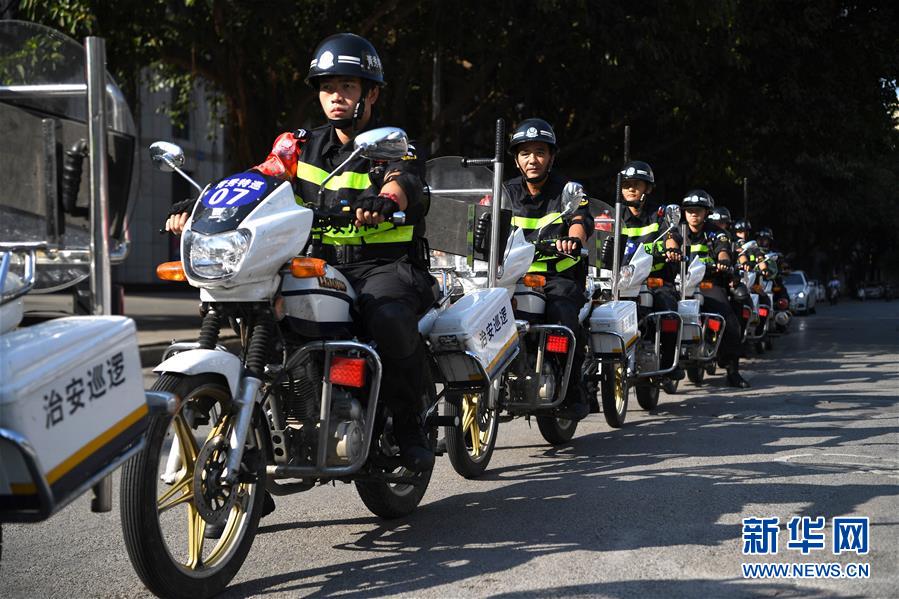 10月1日,廣西南寧市公安局南湖分局治安巡邏隊在南寧市東葛路上巡邏。當(dāng)日是國慶節(jié),許多勞動者堅守在工作一線,在崗位上度過節(jié)日。新華社記者周華攝