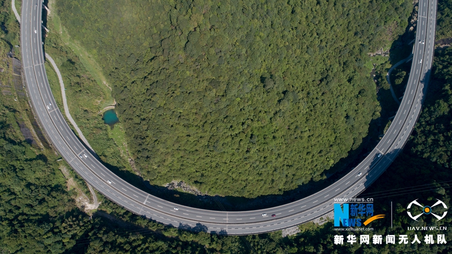 這是廈蓉高速長(zhǎng)下坡龍巖路段的道路景觀,高速路走向形成罕見(jiàn)的半圓形。改擴(kuò)建工程竣工之后,長(zhǎng)下坡將改成上行線,變?yōu)樯掀侣范危o(wú)人機(jī)拍攝)。新華網(wǎng) 肖和勇 攝