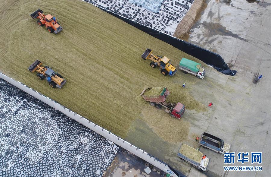 10月8日,工人駕駛機械設(shè)備在青貯飼料場作業(yè)(無人機拍攝)。 近年來,河北省故城縣結(jié)合市場需求,通過“龍頭企業(yè)+基地+農(nóng)戶”的經(jīng)營模式,鼓勵引導(dǎo)農(nóng)民發(fā)展訂單式青貯玉米種植,不僅增加了種植戶收入,而且為養(yǎng)殖企業(yè)提供了優(yōu)質(zhì)飼料。目前,故城縣已發(fā)展青貯玉米種植面積6萬余畝。 新華社記者 朱旭東 攝
