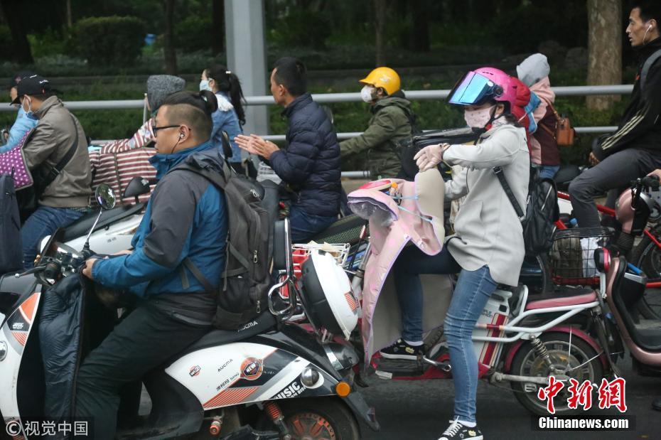 2018年10月9日,山東濟(jì)南,昨日一場(chǎng)秋雨過(guò)后開(kāi)始降溫,今天清晨最低氣溫只有6度,馬路上不少上班族穿上羽絨服騎車(chē)趕上班路。 圖片來(lái)源:視覺(jué)中國(guó)