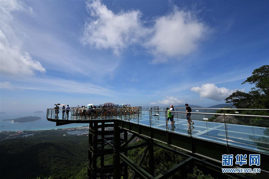 8月31日,游客在玻璃觀景平臺(tái)上參觀游覽。近日,位于海南省三亞市亞龍灣熱帶天堂森林公園的大佛石全海景玻璃棧道開(kāi)始正式營(yíng)業(yè)。凌空而建的玻璃棧道全長(zhǎng)400米,游客可將亞龍灣的美景盡收眼底。新華社記者郭程攝