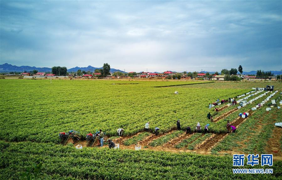 10月9日,秦皇島市撫寧區(qū)留守營(yíng)鎮(zhèn)桑園村農(nóng)民在收獲生姜(無人機(jī)拍攝)。 近年來,河北省秦皇島市撫寧區(qū)在農(nóng)業(yè)結(jié)構(gòu)調(diào)整過程中,引導(dǎo)當(dāng)?shù)剞r(nóng)民種植優(yōu)質(zhì)無公害生姜,并安排農(nóng)業(yè)技術(shù)員定期到田間指導(dǎo)農(nóng)民對(duì)生姜進(jìn)行標(biāo)準(zhǔn)化管理。據(jù)介紹,今年該縣生姜種植面積1萬多畝,預(yù)計(jì)產(chǎn)生姜5萬噸,種植戶每畝純收入達(dá)1萬多元。 新華社記者 楊世堯 攝