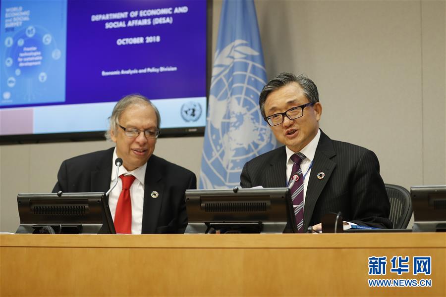 10月8日,在位于紐約的聯(lián)合國總部,聯(lián)合國負(fù)責(zé)經(jīng)濟(jì)和社會事務(wù)的副秘書長劉振民(左)向記者介紹《2018年世界經(jīng)濟(jì)和社會概覽》。新華社記者李木子攝