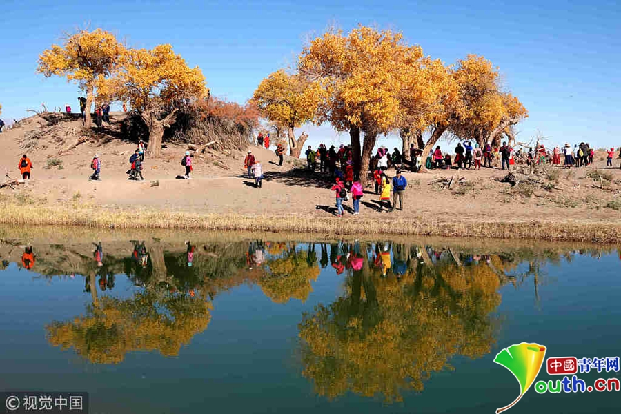 游客在胡楊樹下拍照。